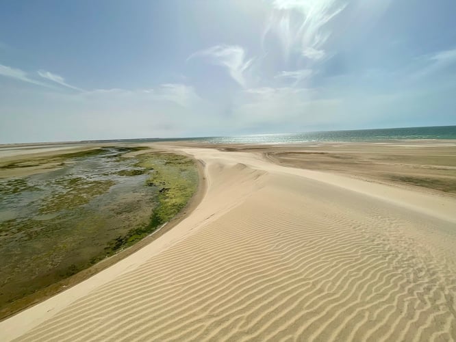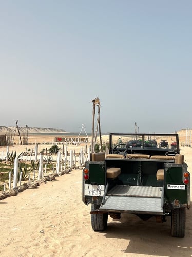 Discover the desert landscapes of Dakhla on a safari adventure, featuring dunes and panoramic views of the Atlantic Ocean, followed by an unforgettable sandboarding experience.